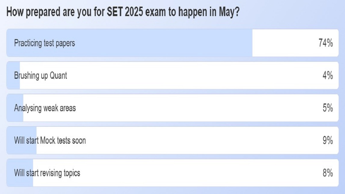 SET 2025 is scheduled to be held on May 5, 2025, and May 11, 2025. With only one month left for the exam, SET preparations of the aspirants are in full swing. Shiksha conducted a recent poll to gain insights into the readiness of the SET aspirants for the SET 2025 exam, and it has revealed that the majority of the students are practicing test papers, underscoring the SET exam day experience.