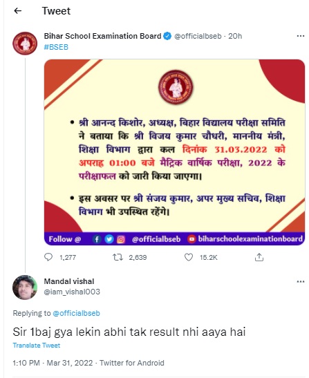 On March 27, 2022, a fake website went viral for claiming to have released the BSEB 10th Results 2022. The site went viral on social media but was later debunked. No official confirmation for the BSEB Matric Results have been made but they are expected to come today.