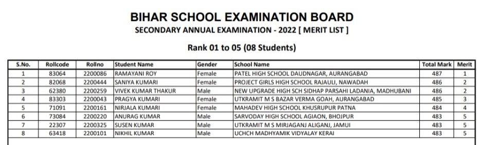Top 5 rank holders: BSEB 10th Topper List 2022