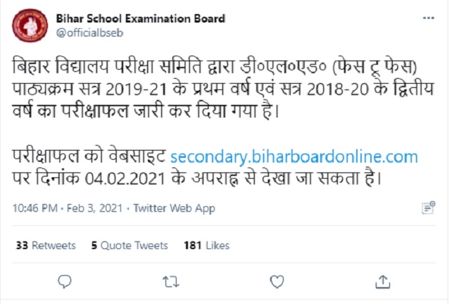 The Bihar School Examination Board (BSEB) has announced that Bihar D.EI.Ed Result 2019-21 for the first-year. The result has been declared for the Bihar Diploma in Elementary Education (D.El.Ed) face to face exam. All candidates who had appeared for the examination can now check the result by visiting the official website of BSEB; i.e. secondary.biharboardonline.com.