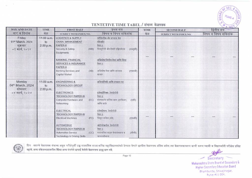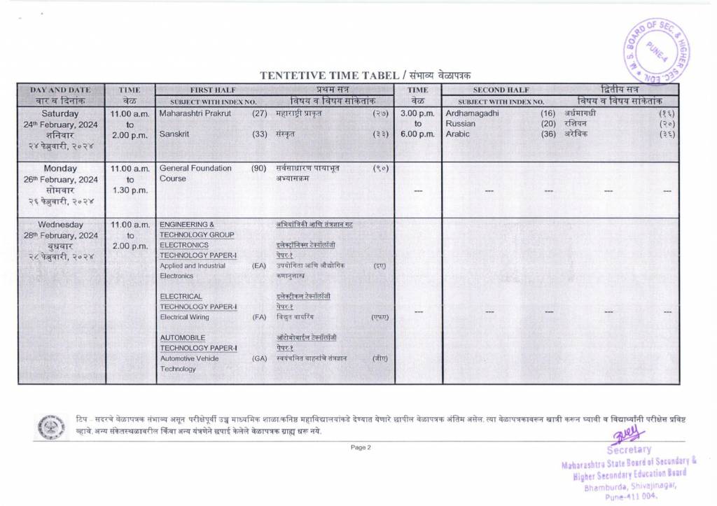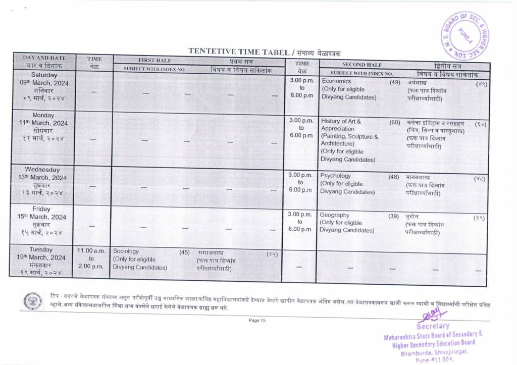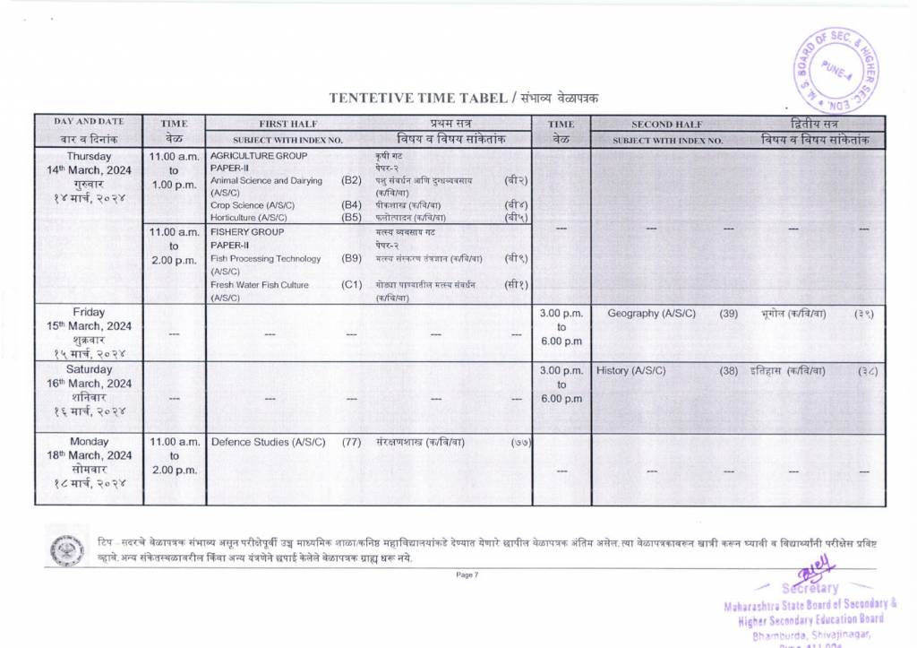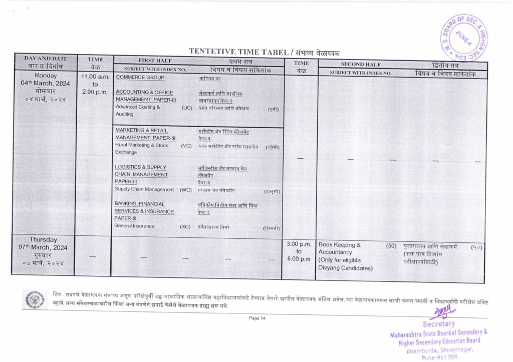 | Maharashtra Board HSC General & Bifocal Timetable 2024 |