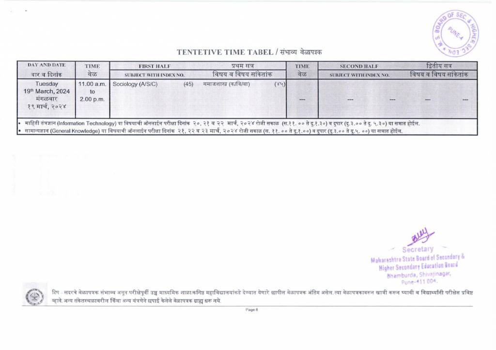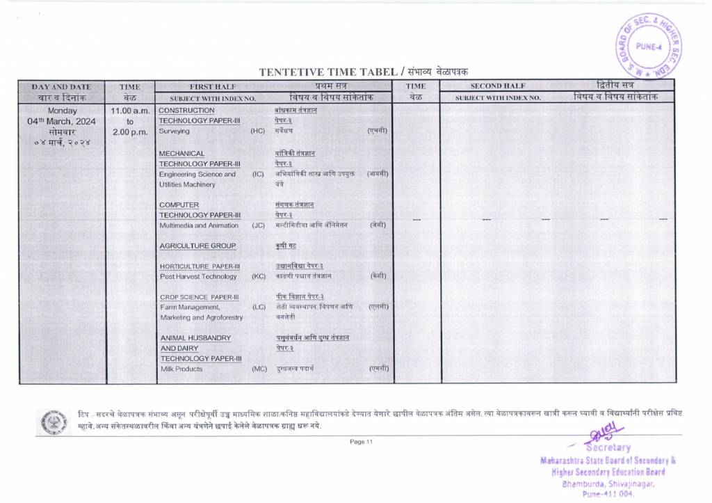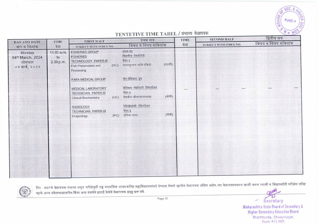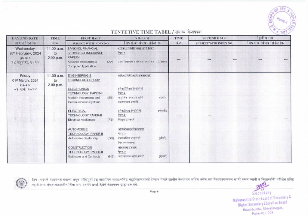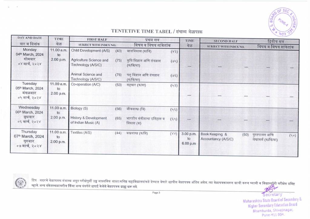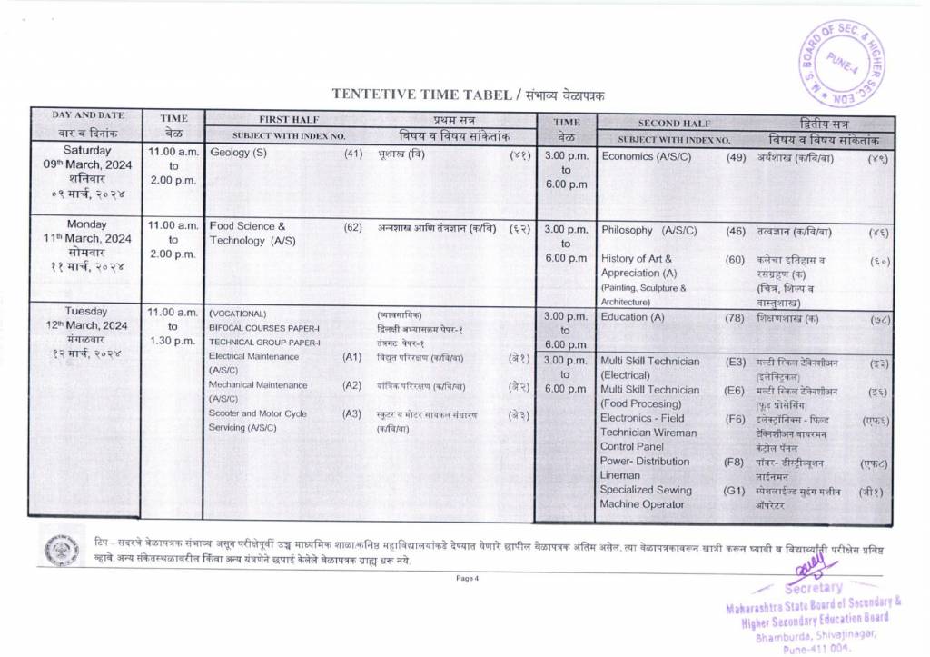 | Maharashtra Board HSC General & Bifocal Timetable 2024 |