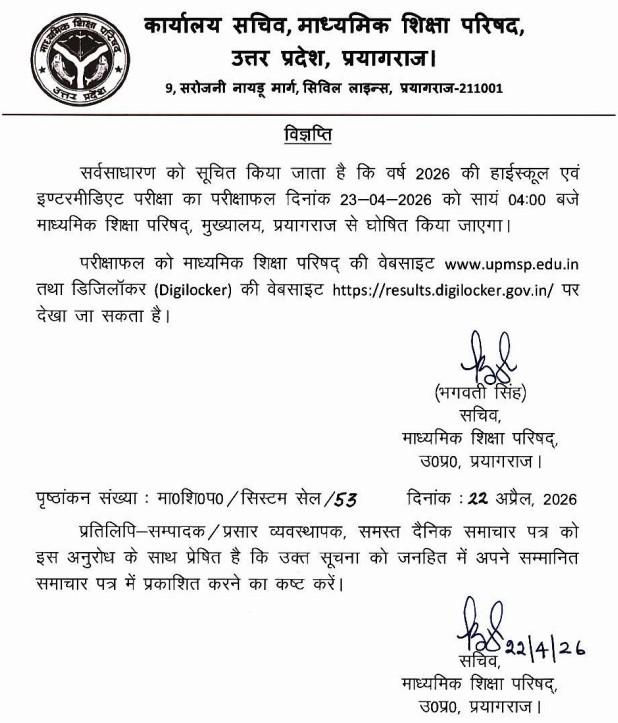 12th Result 2026 UP Board Live Updates: The Uttar Pradesh Madhyamik Shiksha Parishad (UPMSP) will announce the Intermediate Result 2026 UP Board TODAY (April 23) at 4 pm. The board confirmed the UP Board result 2026 class 12 date and time through a notification on its website. UPMSP officials and the state education minister will announce the UP Board class 12 result 2026 in a press conference. Soon after that, the board will activate the Class 12th result 2026 UP Board link online on its website at upresults.upmsp.edu.in and www.upmsp.edu.in 2026. The students are required to use their roll number and district code to check their UP Board 12th result 2026. Students can also check their UP Board result 2026 Class 12 using their alternate options such as SMS, Umang App and DigiLocker.