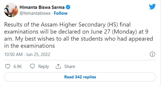 Assam Chief Minister, Himanta Biswa Sarma has announced Assam AHSEC result 2022 time and date via Twitter.