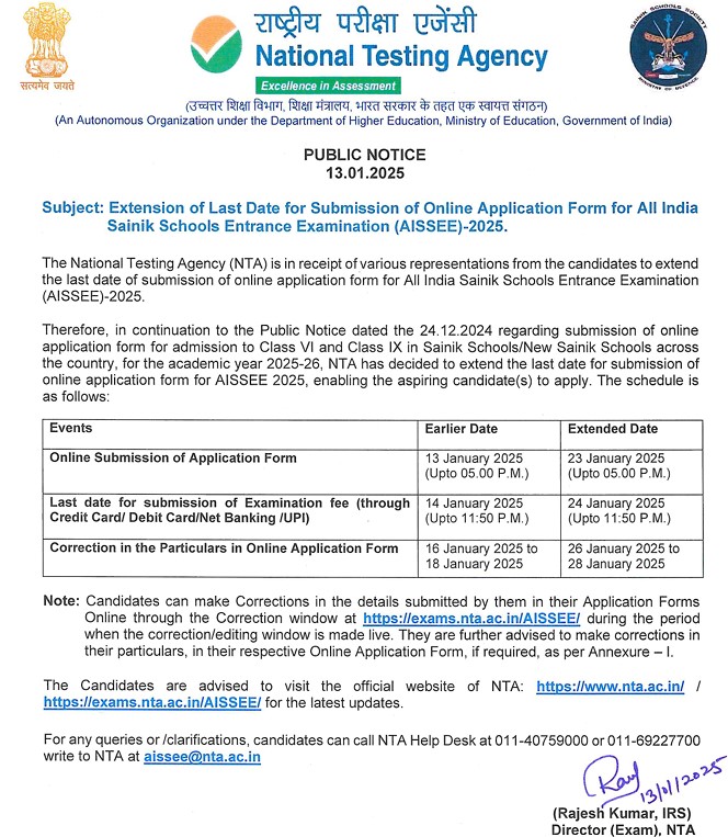 The National Testing Agency (NTA) has extended the registration deadline for the All India Sainik Schools Entrance Examination (AISSEE) 2025. Candidates wishing to apply for the AISSEE 2025 can now complete their registration process until January 23, 2025. The previous deadline has been pushed back to accommodate more applicants.