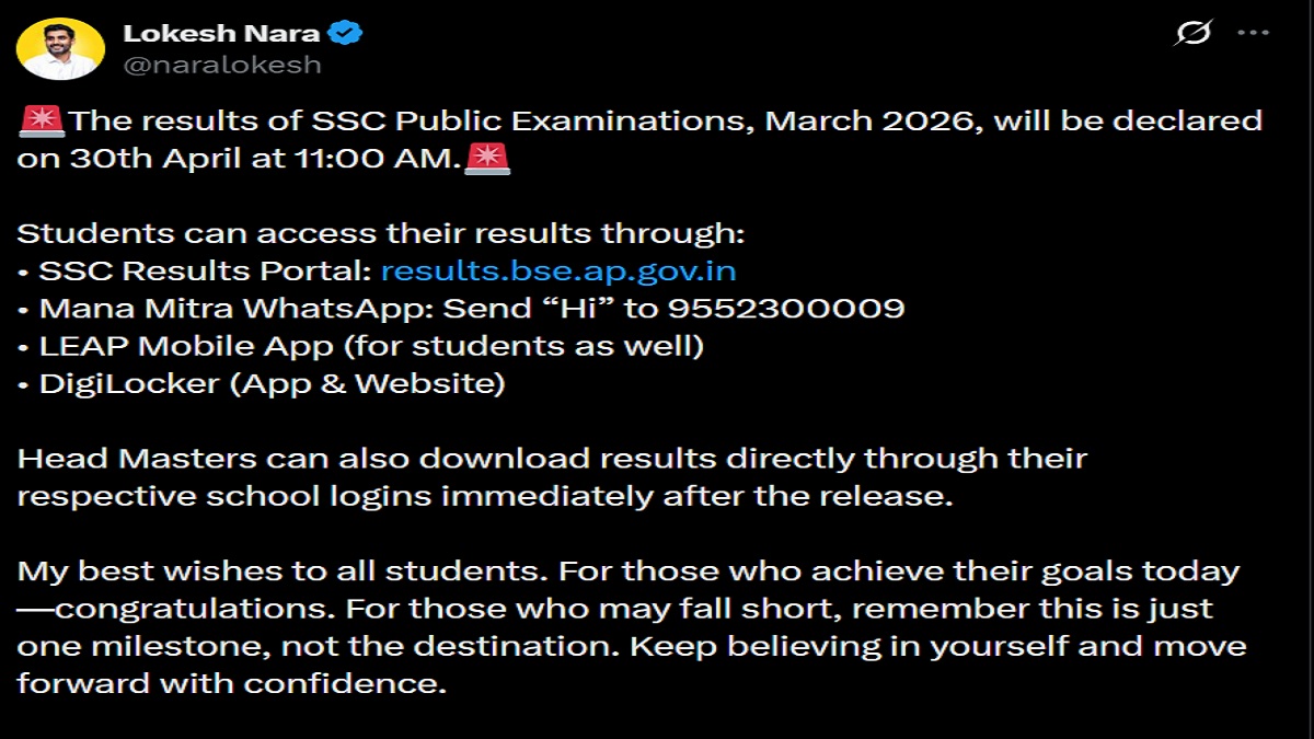 Lokesh Nara has tweeted about AP SSC result date and time today. He tweeted, the results of SSC Public Examinations, March 2026, will be declared on 30th April at 11:00 AM. He also mentioned, Head Masters can also download AP SSC results directly through their respective school logins immediately after the release.