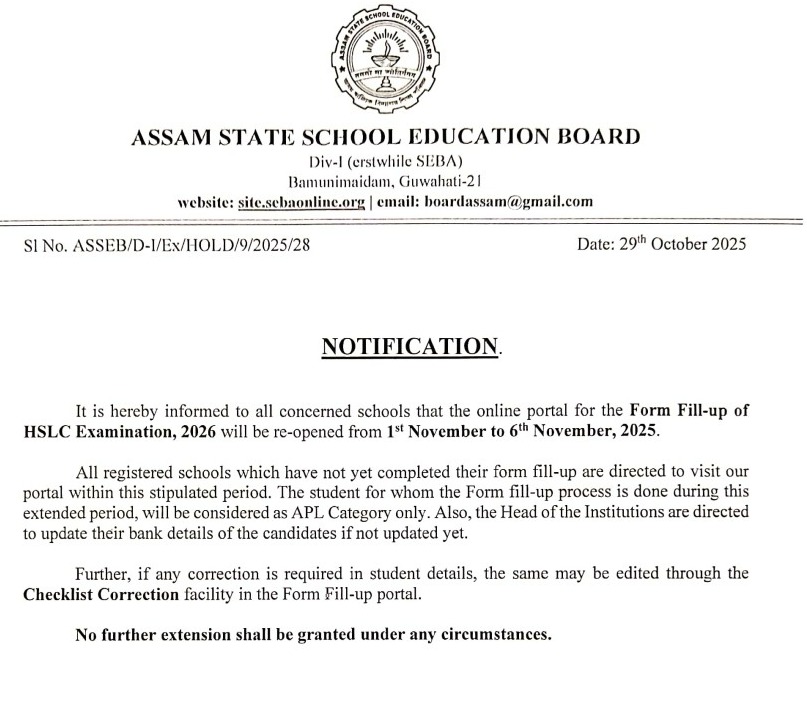 The Assam State School Education Board (Division-I) (ASSEB) announced the Assam HSLC routine 2025 on November 19, 2025. As per the SEBA HS routine 2026, the board will conduct the Assam Board 10th exam from February 10 to 27, 2026. Students can check the detailed date sheet 2026 Assam Board on this page.