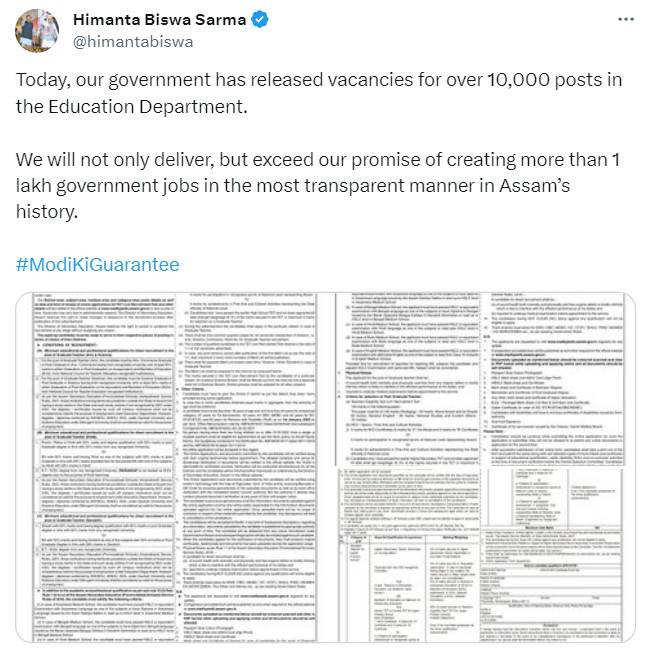 Taking to his X handle Assam CM Himanta Biswa Sharma wrote, "Today, our government has announced advertisements for over 10,000 vacancies in the Education Department. We will not only deliver, but exceed our promise of creating more than 1 lakh government jobs in the most transparent manner in Assam’s history."