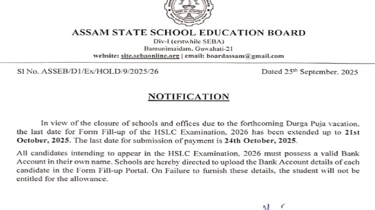 “In view of the closure of schools and offices due to the forthcoming Durga Puja vacation. The last date for Form Fill-up of the HSLC Examination, 2026 has been extended up to 21st October, 2025. The last date for submission of payment is 24th October, 2025. All candidates intending to appear in the HSLC Examination, 2026 must possess a valid Bank Account in their own name. Schools are hereby directed to upload the Bank Account details of each candidate in the Form Fill-up Portal. On Failure to furnish these details, the student will not be entitled for the allowance."