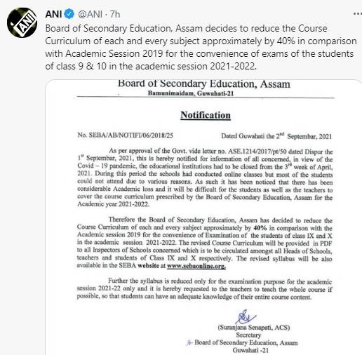 “This SEBA Assam has decided to reduce the course curriculum by 40 per cent in comparison to the academic year 2019. The syllabus has been reduced for Classes 9 and 10 for all subjects. The revised syllabus will be available on the official website www.sebaonline.org.”