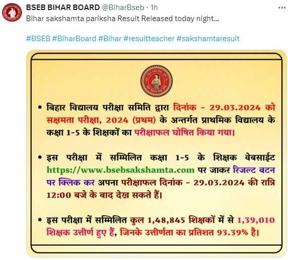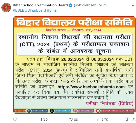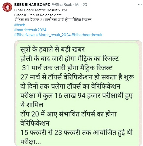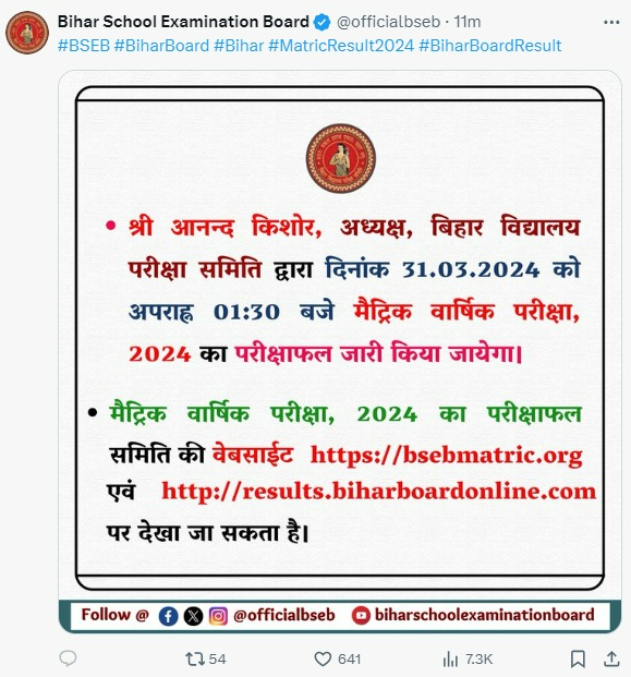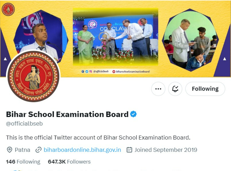 Bihar Board 10th Result 2024: बिहार बोर्ड 10वीं का रिजल्ट 2024 से जुडी लेटेस्ट अपडेट के लिए BSEB को ट्विटर पर @officialbseb फॉलो करें