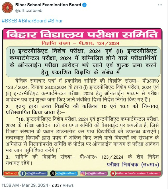 बिहार स्कूल एग्जामिनेशन बोर्ड ने BSEB इंटर कम्पार्टमेंट परीक्षा 2024 से जुड़ी ये जरुरी सूचना प्रदान की है:
