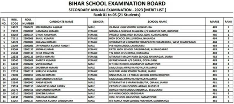 The board has announced the 10th Topper List 2023 Bihar Board along with the Bihar Board 10th result 2023. Students can check the complete BSEB Matric toppers list 2023 below:
