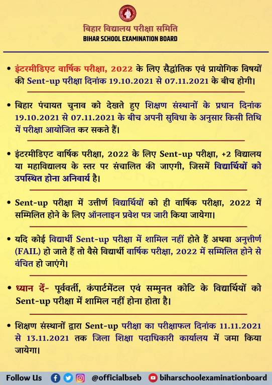BSEB 12th Sent Up exams 2022 are scheduled tentatively between Oct 19 and Nov 7, 2021.