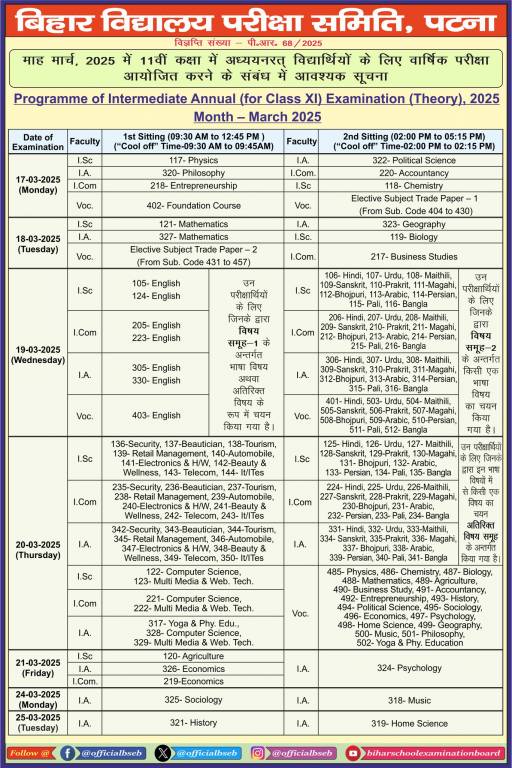 The Bihar board has released the complete schedule for the class 11 annual exams. The board will conduct the Bihar Board Class 11th exams 2025 from March 17 to 25, 2025. The BSEB exams 2025 will be held in two shifts for all three streams.