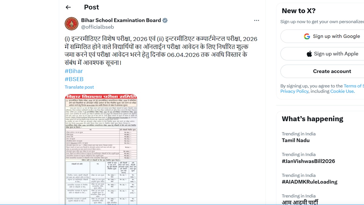 BSEB has extended the application deadline for Intermediate Special and Compartmental Exams 2026. Students can apply to appear in these exams till April 6. The link to fill the application form was activated on Apr 2.