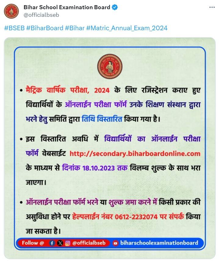 βThe date for filling the online examination form by the educational institution of the students registered for the Matriculation Annual Examination 2024 has been extended,β said BSEB through its official X account (Previously known as Twitter).
