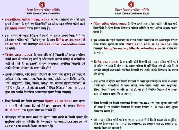 The Bihar School Examination Board (BSEB) has reopened the registration portal for BSEB Class 10 as well as BSEB Class 12. In a notification, released on October 25, on the official Twitter handle of the state board, BSEB has asked school heads to register the remaining students by October 28 with a late fee. In case the exam fee is not deposited within October 28, the school heads can deposit the same till November 1. Further, the state board has also said that in case any student misses out registering for the matric or inter exam, the school head and the student will be responsible for that.