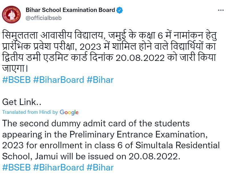 Bihar School Examination Board (BSEB) will issue the second dummy admit card of preliminary examination for admission in Class 6 in Simultala residential school on August 20. The Board through its official Twitter handle said, “The second dummy admit card of the students appearing in the Preliminary Entrance Examination, 2023 for enrollment in class 6 of Simultala Residential School, Jamui will be issued on 20.08.2022.” The dummy admit cards will be released on the board website http://secondary.biharboardonline.com. The dummy admit card can be downloaded by the school principal.