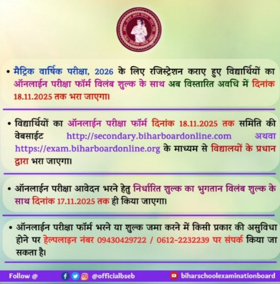 Students who have registered for the BSEB 10th examination form 2026 are now required to submit the exam form by November 18. Students can check the official notification for the same below: