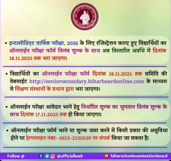 Students who have registered for the class 12 exams are now required to submit the BSEB class 12 examination form 2026 by November 18, with a late fee amount. Check the notification for the same below: