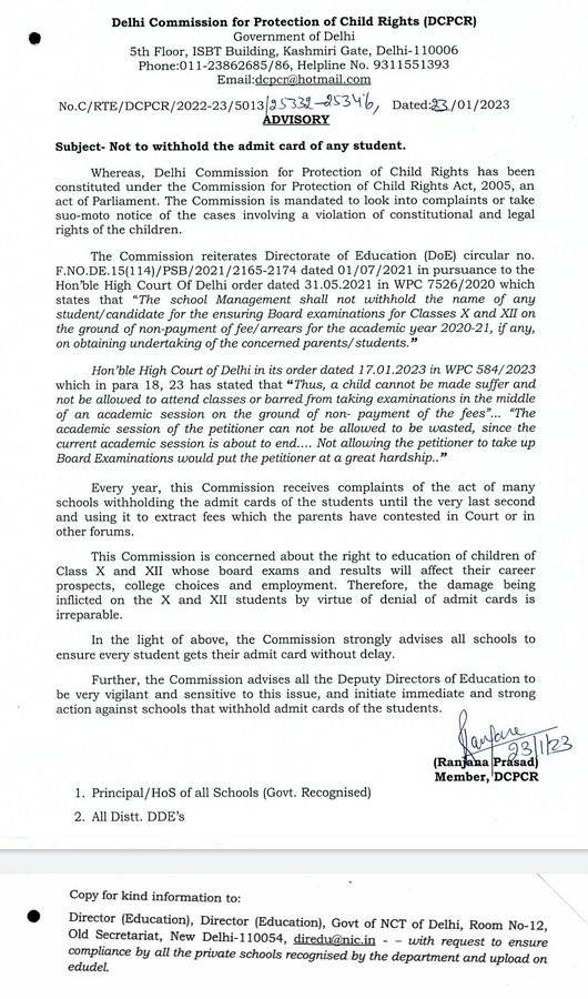 Taking the cognisance, the DCPCR in its advisory has stated, “The Commission reiterates Directorate of Education (DOE) circular no. F.NO.DE.15(114)/PSB/2021/2165-2174 dated 01/07/2021 in pursuance to the Hon'ble High Court Of Delhi order dated 31.05.2021 in WPC 7526/2020 which states that 'The school Management shall not withhold the name of any student/candidate for the ensuring Board examinations for Classes X and XII on the ground of non-payment of fee/arrears for the academic year 2020-21, if any, on obtaining undertaking of the concerned parents/students.''