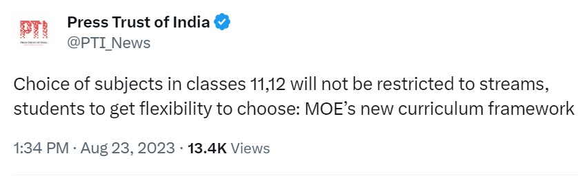 As per the updated curriculum framework, the choice of subjects in classes 11 and 12 will not be restricted to streams such as arts, science, and commerce to give students flexibility to choose.