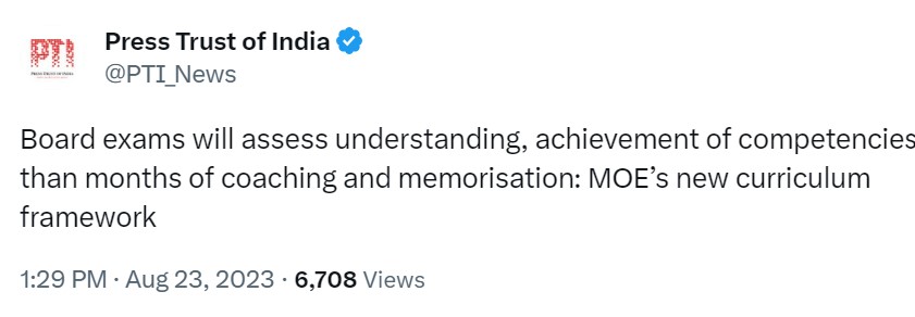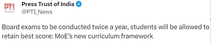 "Board exams will be offered at least twice a year to ensure students have enough time and opportunity to perform well. Students can then appear for a board exam in subjects they have completed and feel ready for. They will also be allowed to retain the best score," the ministry said.