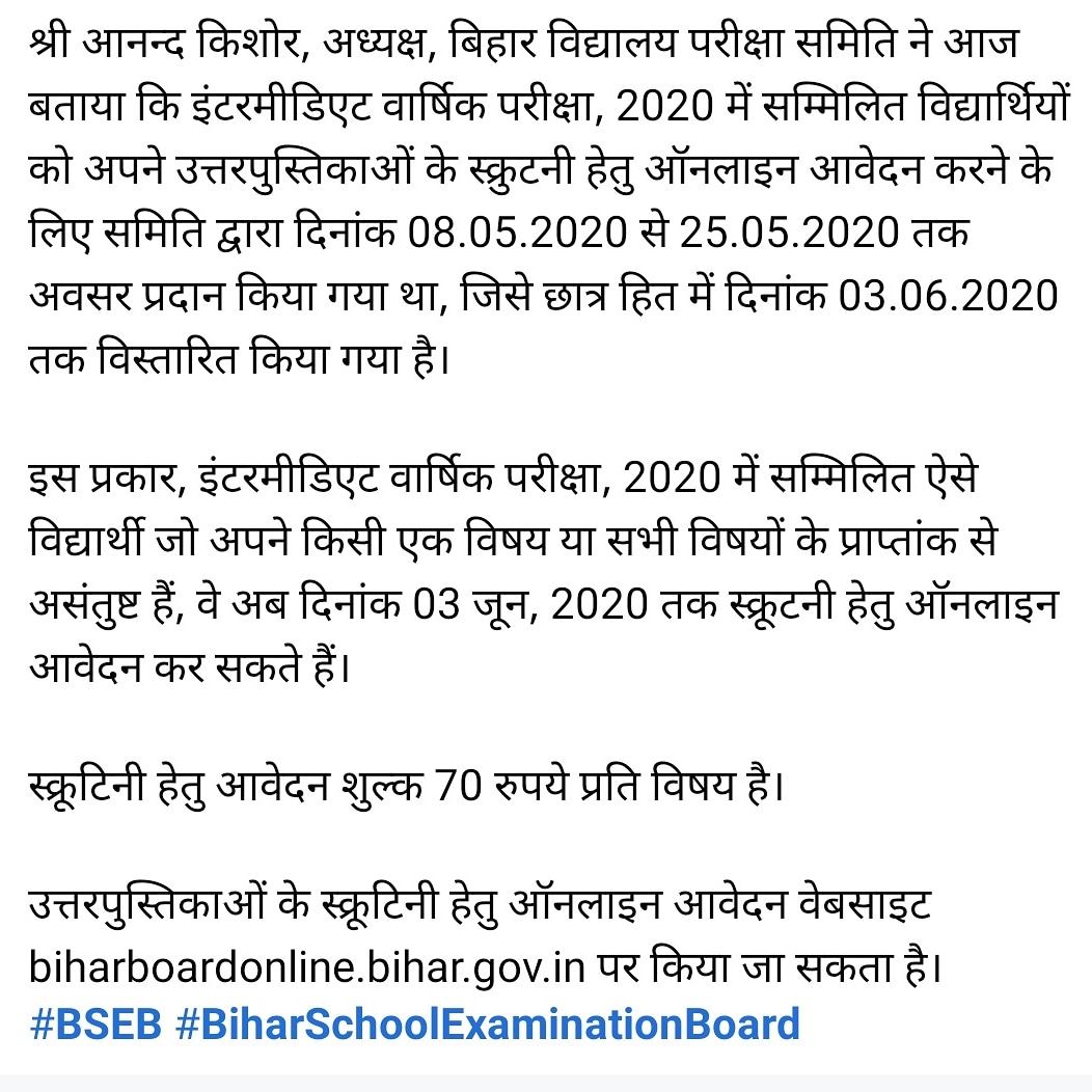 BSEB on its official social media portal declared, “Candidates who are not satisfied with their Bihar Board 12th Results 2020 of one or all the subjects can now apply for scrutiny up to June 3.”
