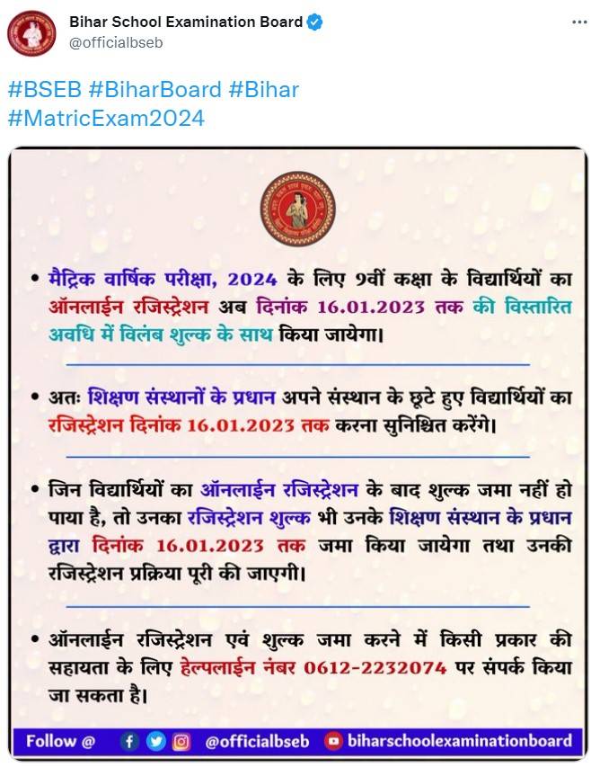 The Bihar Board on its official Twitter handle has made the announcement about the extended date for registration for the matriculation annual examination 2024. Checkout the official tweet below: