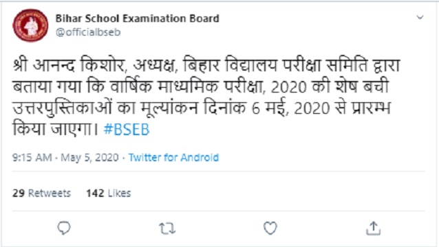 The Bihar School Examination Board (BSEB) has announced that it will start the evaluation process for class 10th board exam sheet from Wednesday i.e. May 6 amid the ongoing nationwide lockdown.