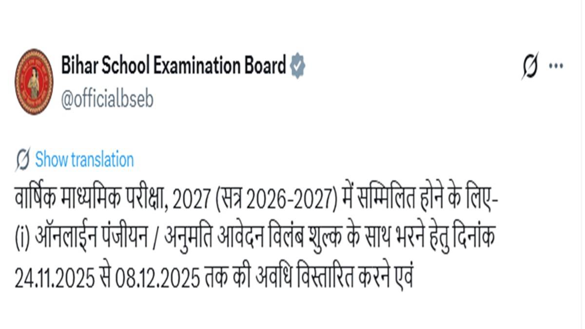 Bihar School Examination Board has announced an extension of online registration and permission application window for Annual Secondary Examination 2027.