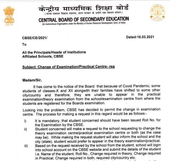 Board has allowed CBSE 10th, 12th students to change the exam centre for their theory and practical exams keeping in view the ongoing COVID19 pandemic.