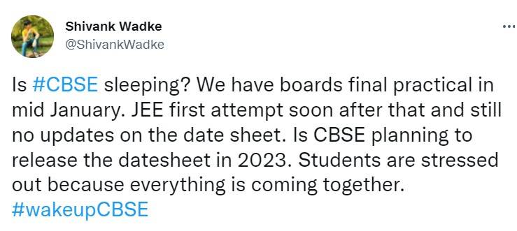 Is #CBSE sleeping? We have boards final practical in mid January. JEE first attempt soon after that and still no updates on the date sheet. Is CBSE planning to release the datesheet in 2023. Students are stressed out because everything is coming together. #wakeupCBSE