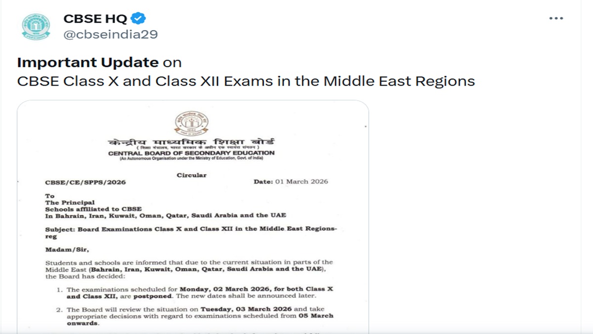 US-Israel Attacks Iran Latest Update: Due to the ongoing Iran-US-Israel Crisis, the Central Board of Secondary Education (CBSE) has postponed CBSE Class 10 & 12 exams 2026 in the Middle East. The Board has issued notice to all the school principals in Bahrain, Iran, Kuwait, Oman, Qatar, Saudi Arabia and the UAE. The notice reads, “Students and schools are informed that due to the current situation in parts of the Middle East (Bahrain, Iran, Kuwait, Oman, Qatar, Saudi Arabia, and the UAE, the Board has decided that the examinations scheduled on March 2, 2026 for both Class 10 & 12 are postponed. The new dates will be announced later.”