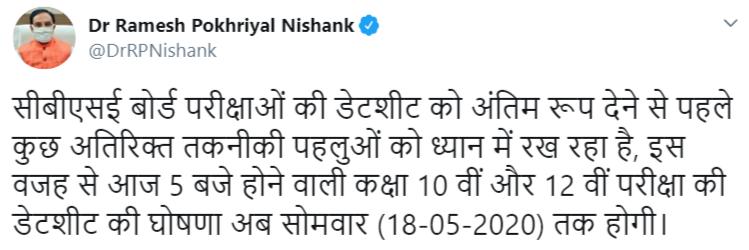 The Human Resource and Development Minister, Dr Ramesh Pokhriyal Nishank is all set to release the CBSE class 10, 12 datesheets for pending exams today i.e. May 18, 2020. Mr. Pokhriyal in his latest tweet stated, "CBSE is taking into consideration some additional technical aspects before finalizing the datesheet of the board exams, due to this, the datesheet of class 10th and 12th examination which was to be announced today at 5 pm will now be announced on Monday (18-05-2020)."