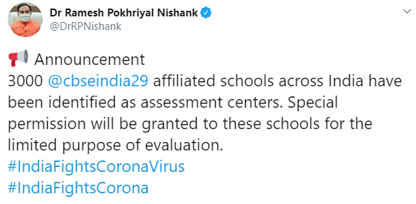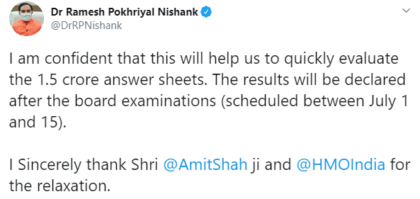 In his tweet, Mr Pokhriyal said, “I am confident that this will help us to quickly evaluate the 1.5 crore answer sheets. The results will be declared after the board examinations (scheduled between July 1 and 15). I sincerely thank Shri @AmitShah ji and @HMOIndia for the relaxation.#IndiaFightsCorona”
