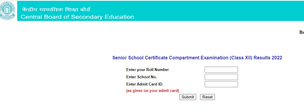 CBSE 12th Compartment Exam Result 2022 login window