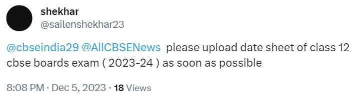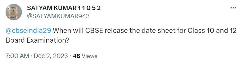 Students around the nation are demanding the release of CBSE Class 10, 12 date sheet 2024. Following is the compilation of the posts shared by students demanding "Release CBSE Date Sheet 2024!" Once released, CBSE date sheet 2024 will be available online at cbse.gov.in and cbse.nic.in.