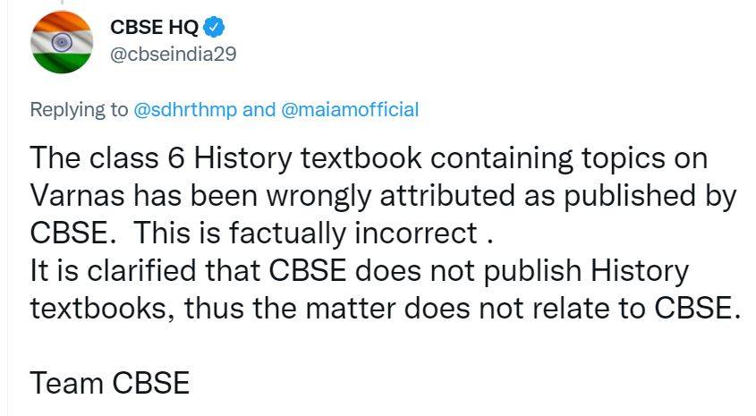 Responding to the accusations, the CBSE Team through the official Twitter account of the Board said, “The class 6 History textbook containing topics on Varnas has been wrongly attributed as published by CBSE. This is factually incorrect .