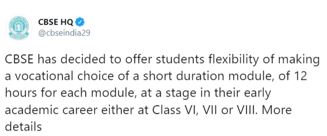 According to this reform, students of classes 6, 7, and 8 will be able to study one Skill Module of 12 hours duration for a single academic session. The choice to opt Skill Module either at class 6 or class 7 or class 8 is free for Schools and students both.