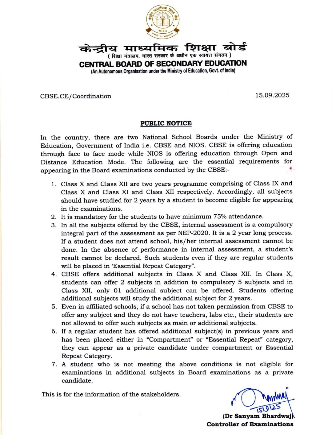 “A student who is not meeting the above conditions is not eligible for examinations in additional subjects in Board examinations as a private candidate,” mentions CBSE notice informing of the stakeholders.