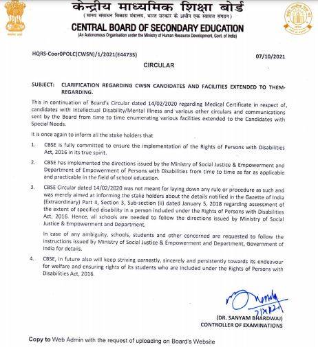 An official notification released by the Central Board of Secondary Education (CBSE) on its official website, dated, October 7, 2021 talks about the facilities extended by the Board to Children with Special Needs or CWSN candidates. The circular has been released in continuation to a circular dated 14/02/2020 released by the Board with regards to the medical certificate of candidates with Intellectual Disability or Mental Illness.
