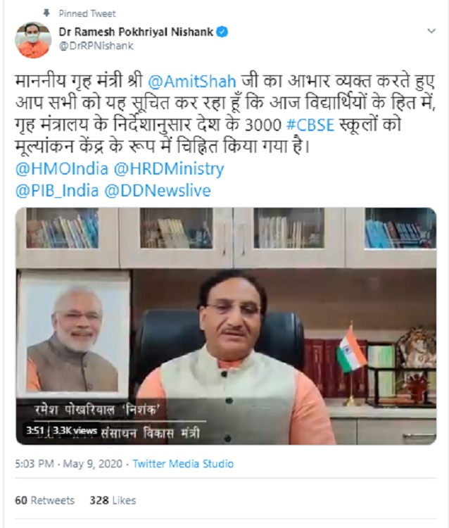 The Union HRD Minister Ramesh Pokhriyal today said that the CBSE 10th and CBSE 12th answer sheets will be evaluated by the teachers from home. He also announced that the Ministry of Home Affairs have earmarked 3,000 schools for the evaluation process.