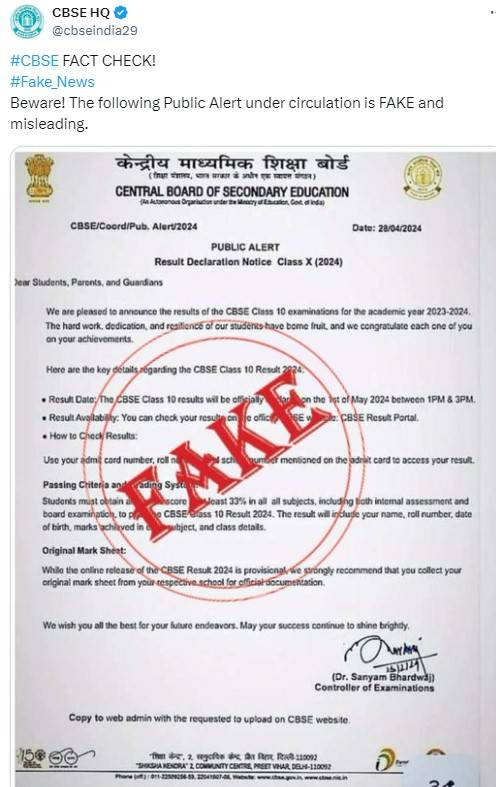 A notice announcing CBSE Board Result 2024 Class 10 date and time viral over social media earlier today. The Board has released warning against fake news for students and parents!