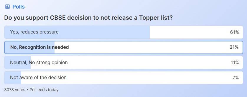 CBSE Result 2025 is around the corner. The Board releases the results through its official website, i.e. cbseresults.nic.in. Shiksha.com conducted a poll asking opinions on the Board's decision to not release the CBSE Topper List 2025. Read further to know what students have to say about the decision.