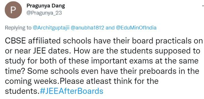 CBSE students are flooding Twitter with #JEEAfterBoards concerning that CBSE Board Practical Exams 2023 and CBSE Class 12 board exams 2023 dates classes with JEE Mains 2023. Demands to conduct JEE after CBSE Board Exams started flowing all over social media soon after the release of CBSE Board Exams 2023 Datesheet.