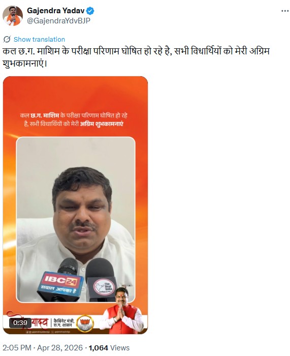 कल ही राज्य के शिक्षा मंत्री ने एक ट्विटर पोस्ट के जरिये ऑफिसियल CG Board Result 2026 डेट एंड टाइम की घोषणा की थी जिसे छात्र निचे भी देखे सकते हैं: