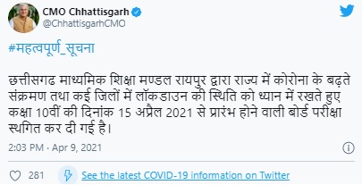 The State Chief Minister tweeted, "Chhattisgarh Board of Secondary Education, Raipur has postponed the CGBSE 10th board exams starting from April 15, 2021, keeping in mind the rise in COVID cases in the state and lockdown in many districts."