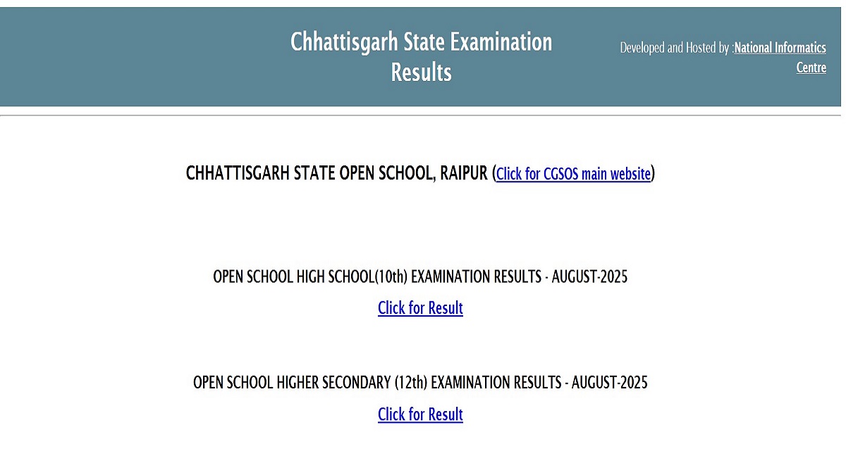 Chhattisgarh State Open School has declared CGSOS Class 10 and 12 results today October 7. Students who appeared for open school exams can check their CGSOS Open School results 2025 by visiting official websites results.cg.nic.in and sos.cg.nic.in. They need to use their roll number and captcha code to download Chhattisgarh Open School Class 10th, 12th results.